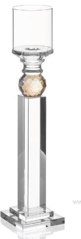 candelabro realizzato in cristallo trasparente con design elegante e struttura slanciata. presenta un elemento centrale sfaccettato con tonalità ambrata che valorizza la luminosità dell’oggetto. base geometrica stabile e supporto superiore per candela. altezza 31,5cm