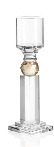 candelabro realizzato in cristallo trasparente con design elegante e struttura slanciata. presenta un elemento centrale sfaccettato con tonalità ambrata che valorizza la luminosità dell’oggetto. base geometrica stabile e supporto superiore per candela. altezza 25cm