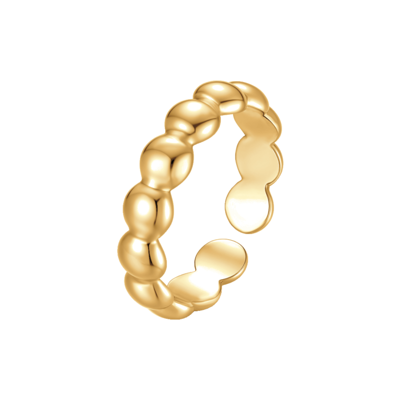 anello regolabile, da donna ,dal design minimal e contemporaneo, caratterizzato da una delicata lavorazione a palline che crea un elegante effetto luminoso e armonioso. realizzato in acciaio 316l con finitura color oro, anallergico, garantisce resistenza, brillantezza e durata nel tempo, ideale per essere indossato ogni giorno.