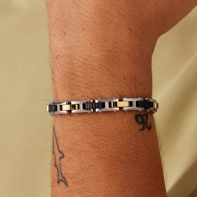 bracciale in acciaio 316l e finitura pvd colore rutenio e finitura pvd oro 14k. misura bracciale: 22cm.