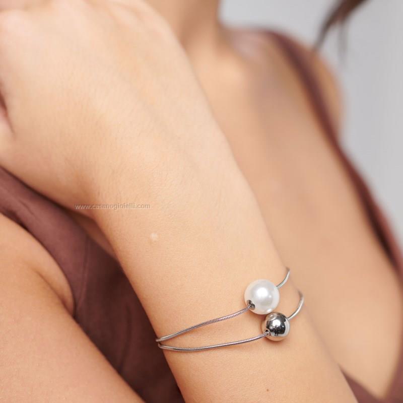 bracciale multifilo in acciaio 316l con centrale a sfera e perla di conchiglia. misura bracciale: 19cm