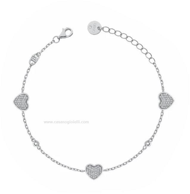 bracciale da donna di liu jo. il giropolso è realizzato in argento 925. il gioiello è caratteriazzato da tre cuori con zirconi di colore bianco. chiusura con moschettone. lunghezza 20 cm.