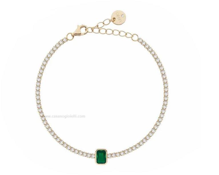 bracciale da donna di liu jo. il giropolso è realizzato in argento 925 color oro. il gioiello, modello tennis, è caratteriazzato da un zircone centrale rettangolare di colore verde. chiusura con moschettone. lunghezza 20 cm.