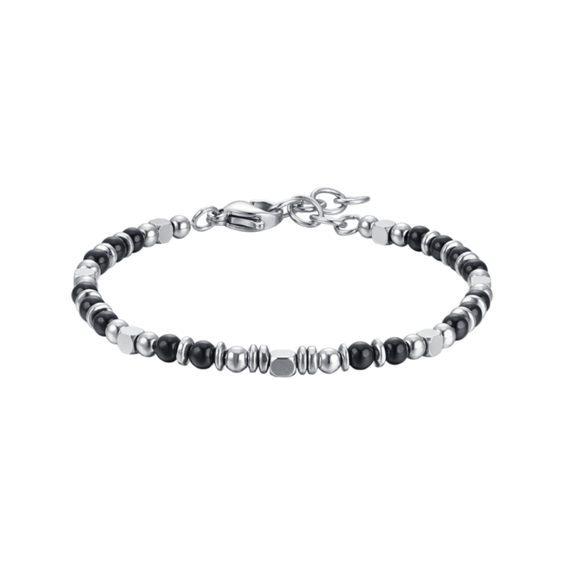 bracciale bimbo in acciaio 316l con pietre nere e grigie. lunghezza: 14 + 2 cm.