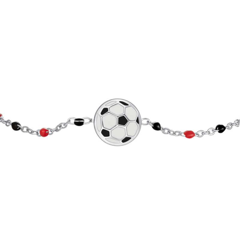 bracciale bimbo in acciaio 316l, con palla da calcio e pietre nere e rosse in alternanza. lunghezza bracciale 14+2mm