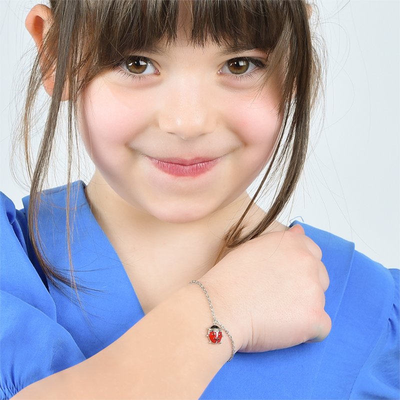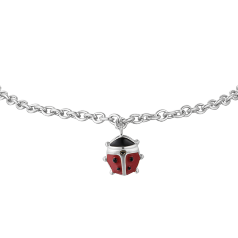 bracciale bimba in acciaio 316l con coccinella decorata con smalto rosso e nero. lunghezza: 14 + 2 cm.