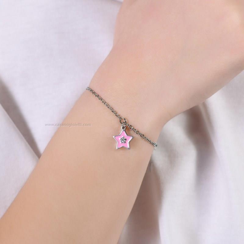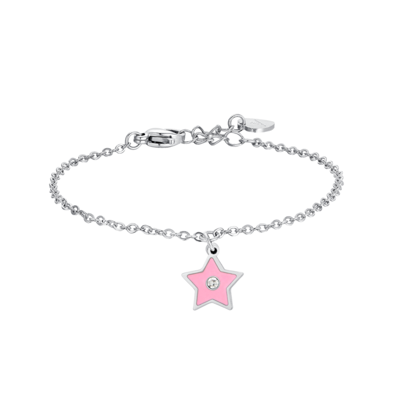 bracciale bimba in acciaio 316l con stella rosa impreziosita da piccoli cristalli bianchi. lunghezza: 14 + 2 cm.