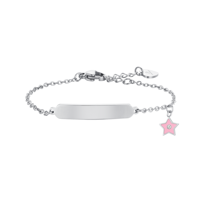 bracciale da bimba con stella rosa e targhetta da poter incidere, in acciaio 316l, lunghezza bracciale 14+2 cm