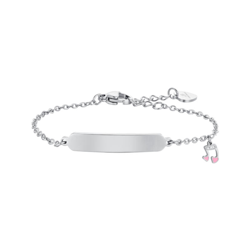 bracciale da bimba con nota musicale rosa e cristalli, targhetta da poter incidere, in acciaio 316l, lunghezza bracciale 14+2 cm