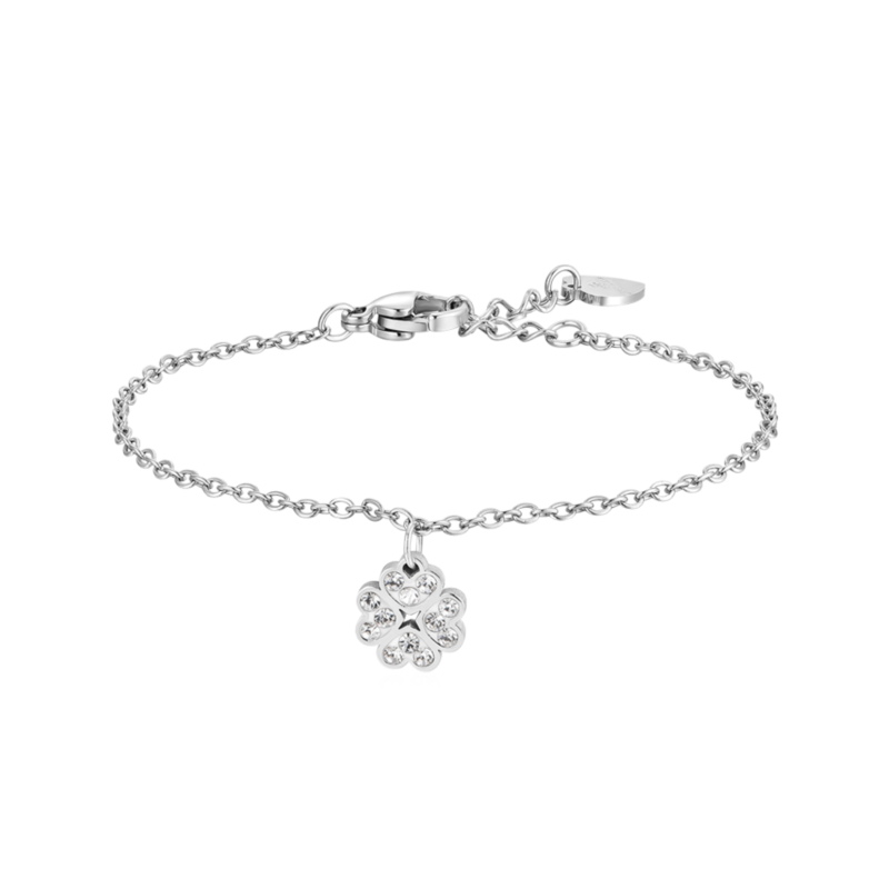 bracciale bimba in acciaio 316l con quadrifoglio impreziosito da piccoli cristalli. lunghezza: 14 + 2 cm.