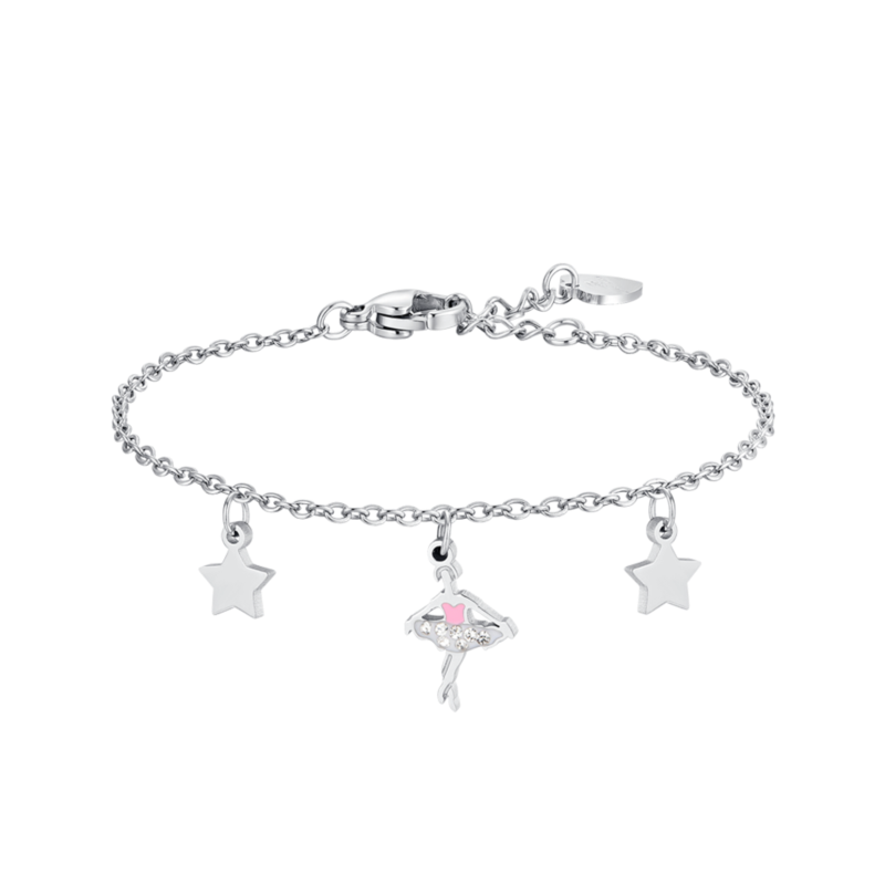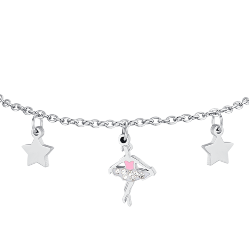 bracciale bimba in acciaio 316l con ballerina decorata con smalto rosa, cristalli bianchi e stelle. lunghezza: 14 + 2 cm.
