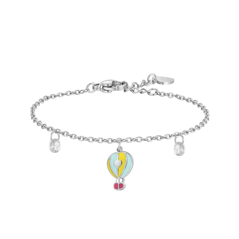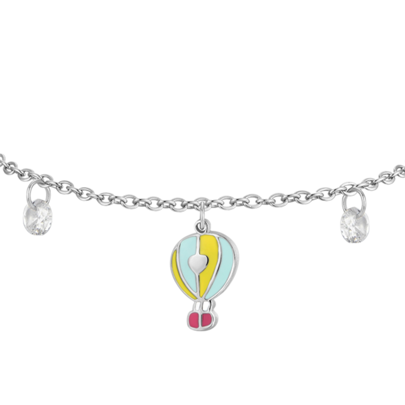 bracciale bimba in acciaio 316l con mongolfiera colorata e piccoli cristalli pendenti . lunghezza: 14 + 2 cm.
