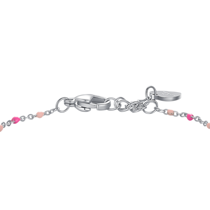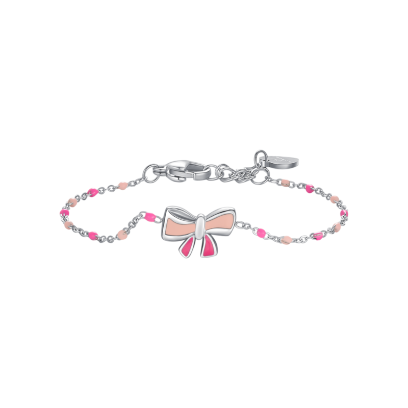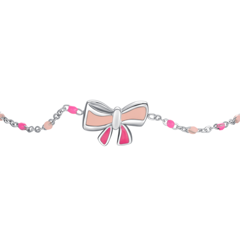 bracciale bimba in acciaio 316l,con fiocco decorato con smalto rosa e fucsia e pietre colorate alternate .lunghezza 14 + 2cm