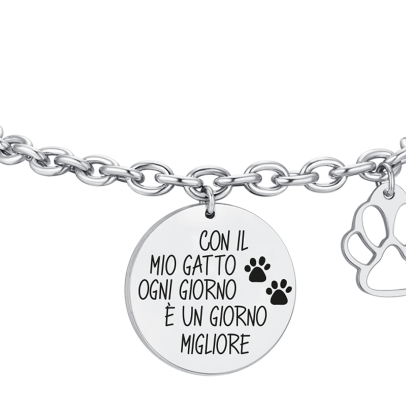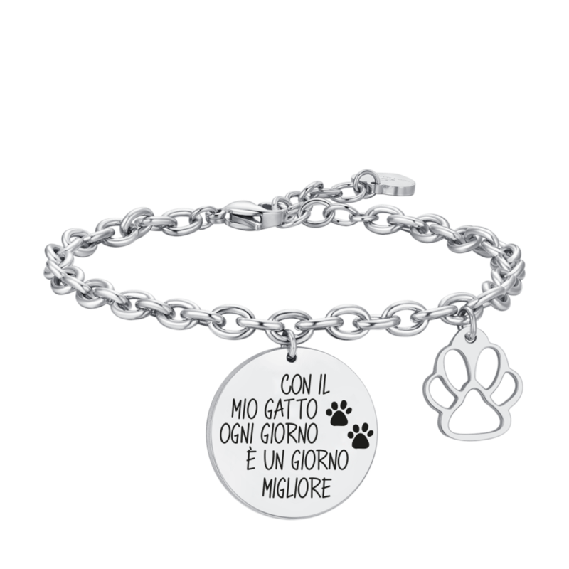 bracciale da donna realizzato in acciaio 316l, con medaglia pendente decorata con la frase “con il mio cane ogni giorno è un giorno migliore” realizzata con smalto nero. il design è completato da una zampetta, simbolo dell’affetto e della fedeltà del proprio cane.