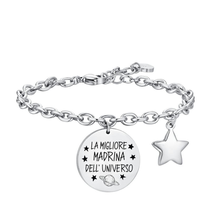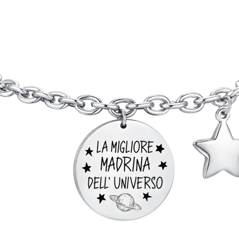 bracciale da donna realizzato in acciaio 316l, con medaglia pendente decorata con la frase “la migliore madrina dell’universo” realizzata con smalto nero. il design è completato da una stella, simbolo di affetto, guida e legame speciale.