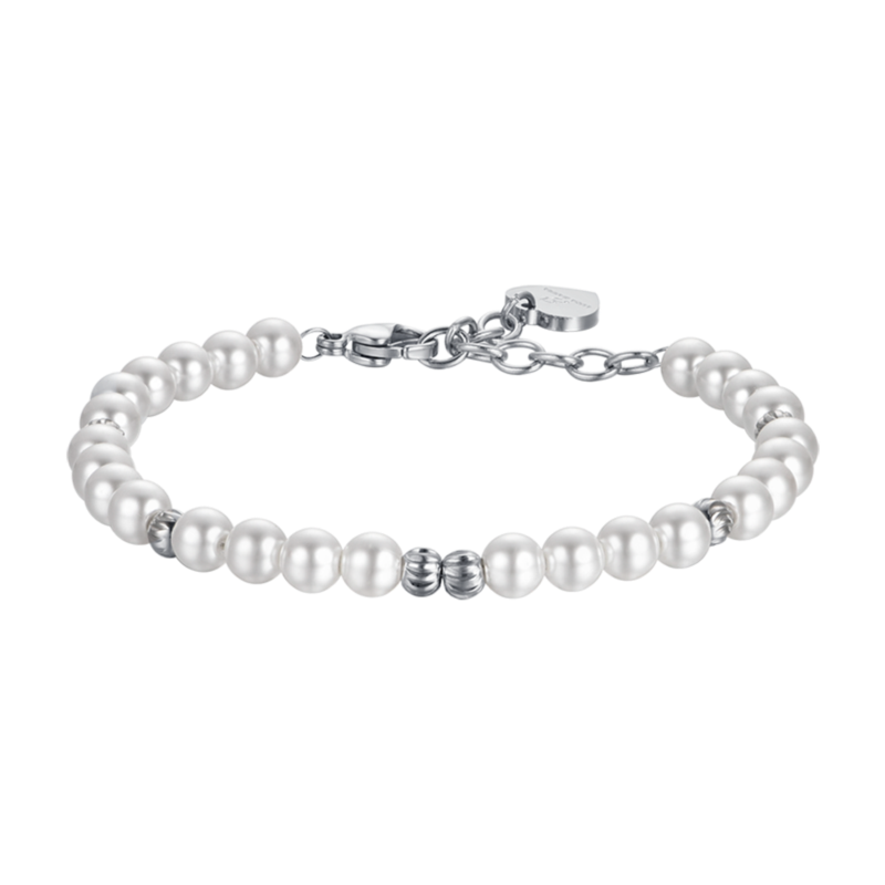 bracciale in acciaio con perle sintetiche bianche ed elementi in acciaio . lunghezza: 17 + 3 cm. un gioiello passepartout che non passa mai di moda.