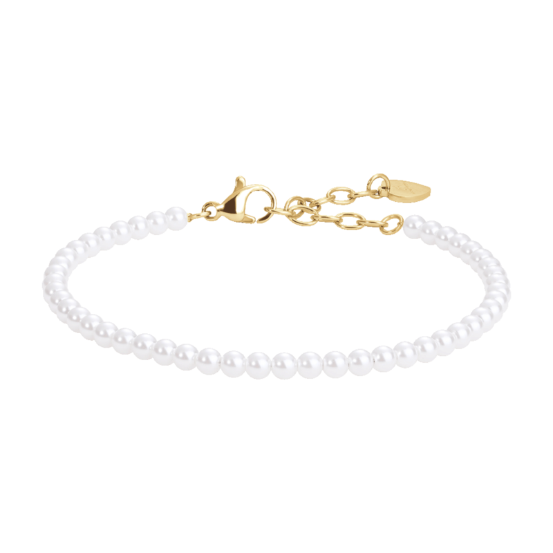 bracciale donna in acciaio colore oro con perle bianchelunghezza: 16 + 3 cm diametro perla: 3,5 mm