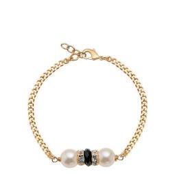 bracciale donna dal design raffinato con finitura color oro, impreziosito da eleganti perle centrali e luminosi dettagli con cristalli neri. un accessorio versatile e femminile, perfetto per donare un tocco di classe ad ogni look.