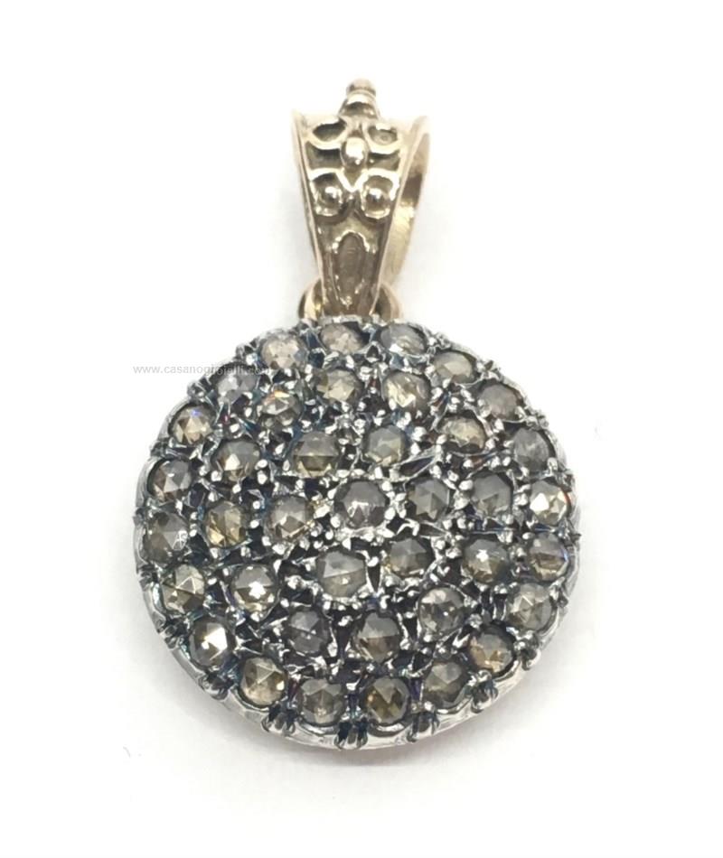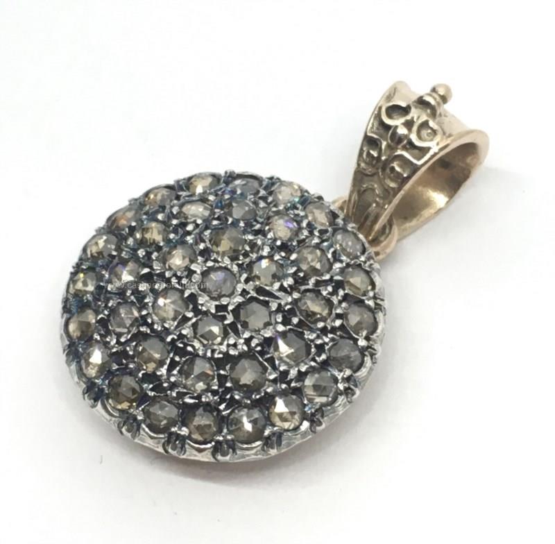 ciondolo stile antico a toppa rotondo diametro 18 mm con diamanti taglio rose coronè per un totale di 1.30 carati, realizzato a mano in oro 375/1000 e argento 925/1000
