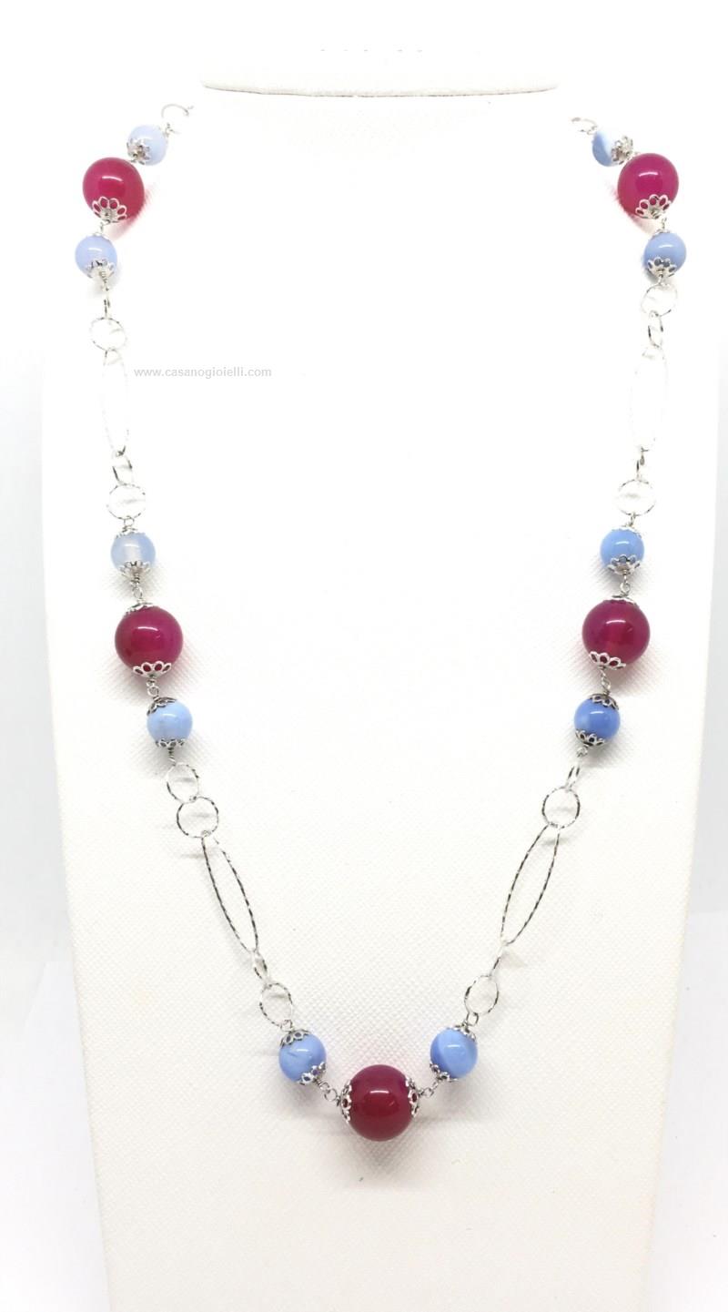 collana con pietre dure agata azzurra e fucsia in argento 925/°°. lunghezza collana 55 cm con chiusura a grilletto. la pietra di agata azzurra ha significato di aiutare le persone a raggiungere spazi spirituali superiori e la sintonia interiore, è una pietra calmante per la mente e aiuta a lenire le emozioni, incoraggia la comunicazione, la pazienza e la gentilezza, aiuta a rimuovere i blocchi dal sistema nervoso. la pietra di agata fucsia pare possa alleviare le ostilità e promuovere la buona volontà, può aiutare discernere la verità, accettare tutte le circostanze che si possono verificare, ed è un potente guaritore emotivo e usata nella meditazione, migliora la memoria e la concentrazione, aumenta e incoraggia l'onestà.