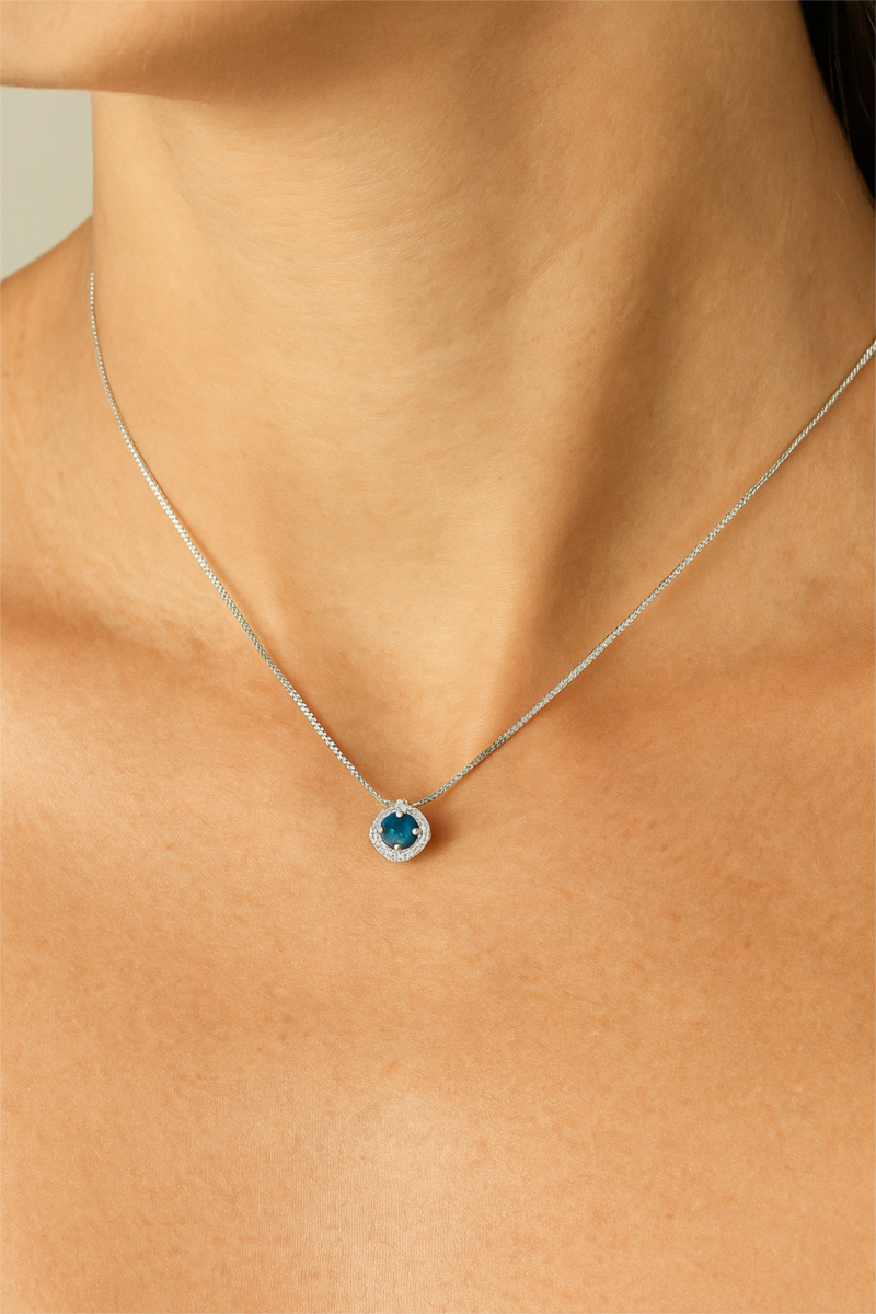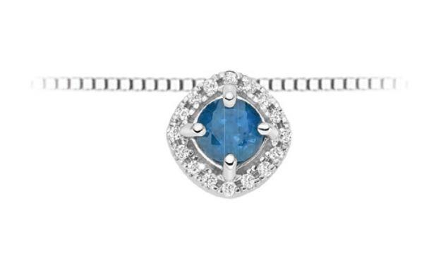 collana con zaffiro ct. 0,20 contornato da diamanti taglio brillante ct. 0,04 colore g purezza si, realizzato in oro bianco titolo 750/°°. lunghezza collana 42 cm.
