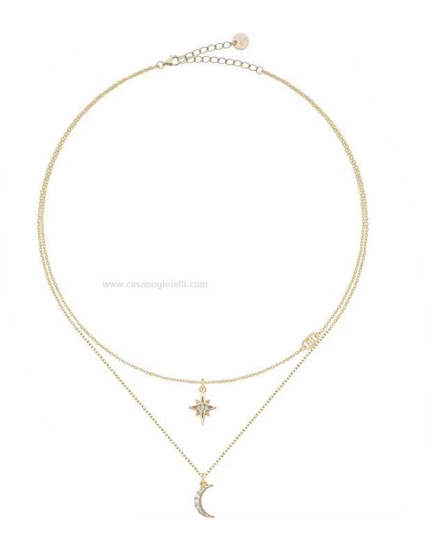 collana da donna di liu jo. il girocollo è realizzato in argento 925 dorato, modello multifilo con pendenti uno a stellina e l''atro a forma di luna, entrambi al loro interno portano dei zircoi bianchi. lunghezza regolabile tra i 50 e i 55 cm grazie alla catena di allungo.