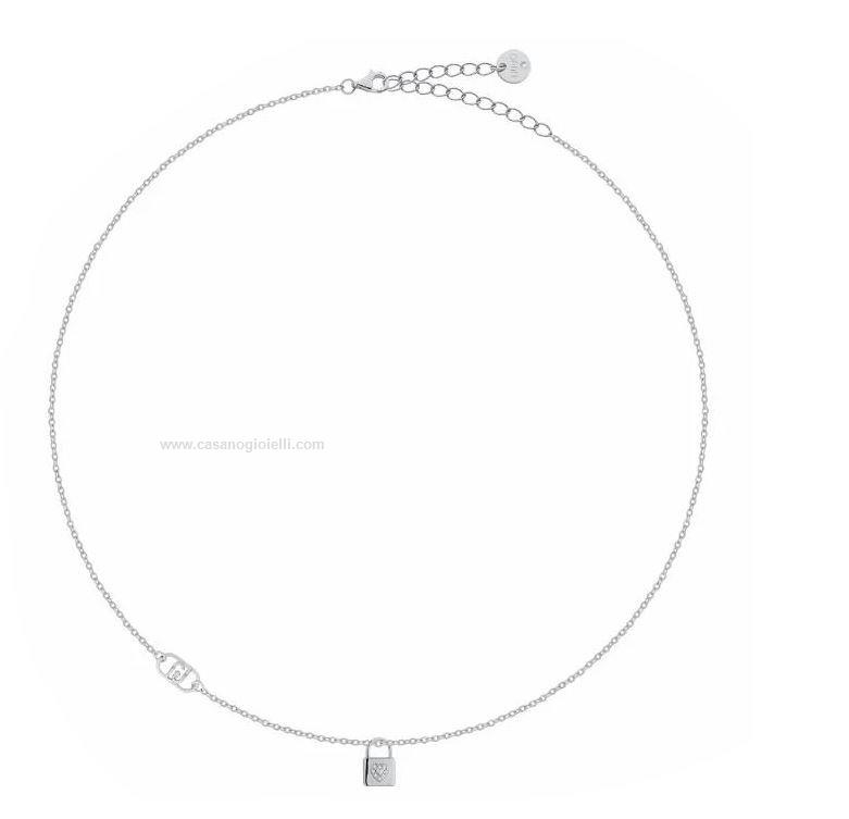 collana da donna di liu jo. il girocollo è realizzato in argento 925, con pendente a lucchetto e zirconi bianchi. lunghezza regolabile tra i 45 e i 50 cm grazie alla catena di allungo.