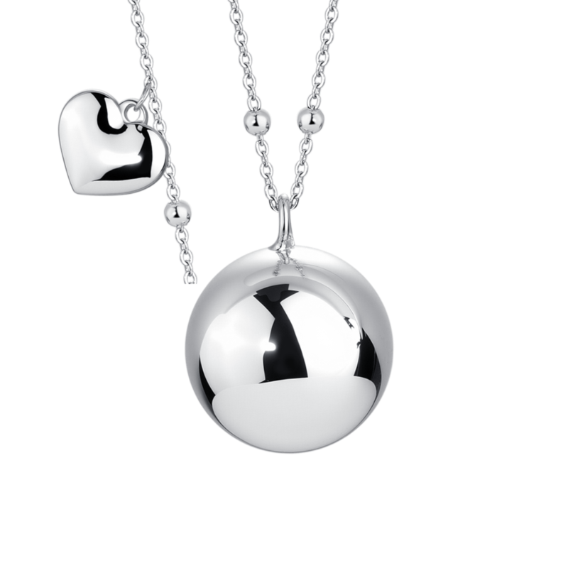 elegante collana chiama angeli da donna realizzata in acciaio 316l, con ciondolo sfera in metallo impreziosito da un delicato charm a forma di cuore. la collana ha una lunghezza di 90 + 10 cm, regolabile per adattarsi perfettamente allo stile di chi la indossa. la sfera chiama angeli ha un diametro di 20 mm e dona al gioiello un tocco raffinato e simbolico, rappresentando protezione, amore e affetto.
