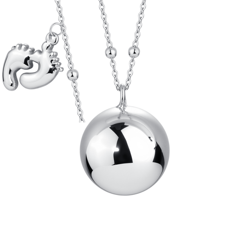 elegante collana chiama angeli da donna realizzata in acciaio 316l, con ciondolo sfera in metallo impreziosito da un delicato charm a forma di piedini. la collana ha una lunghezza di 90 + 10 cm, regolabile per adattarsi perfettamente allo stile di chi la indossa. la sfera chiama angeli ha un diametro di 20 mm e dona al gioiello un tocco raffinato e simbolico, rappresentando protezione, amore e affetto.