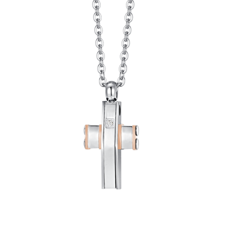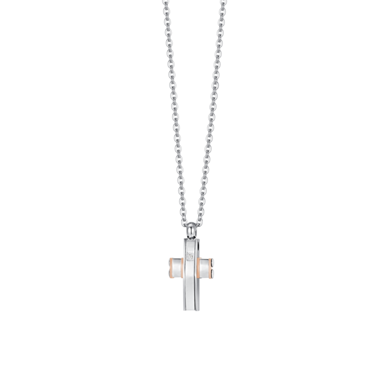 collana da uomo con croce, zirconi bianchi, acciaio 316l e acciaio ip rosè. lunghezza collana 45+5cm