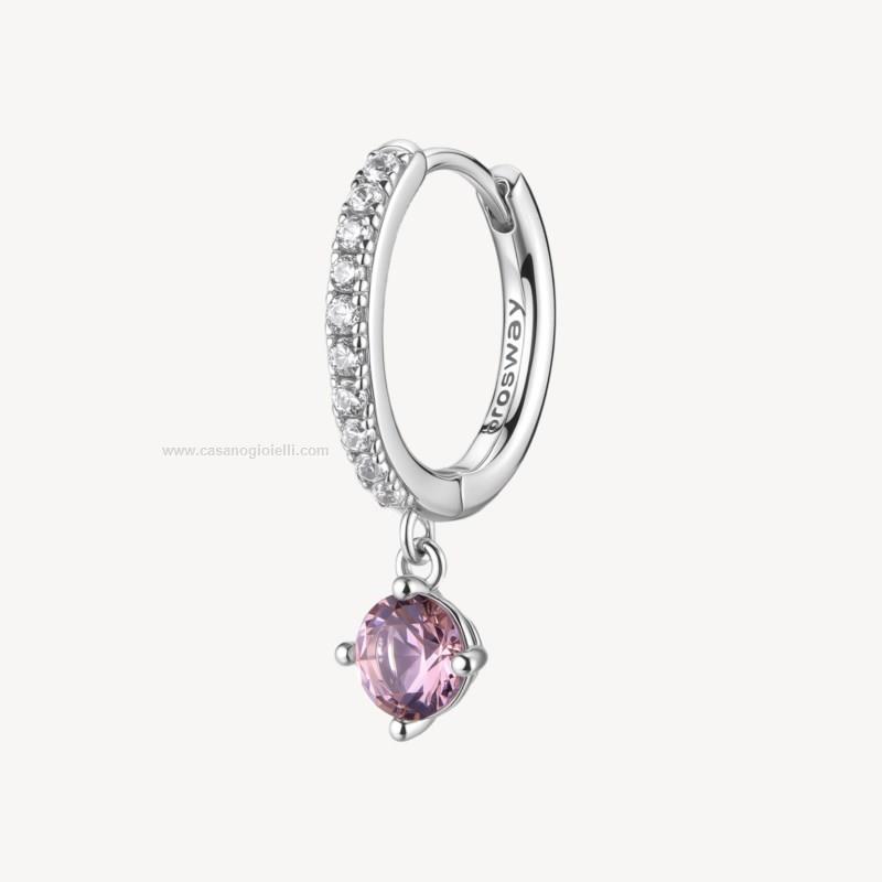 orecchino da donna singolo a cerchietto della linea fancy in argento 925‰ con cubic zirconia chiari e pendente con round cubic zirconia colore vintage rose.