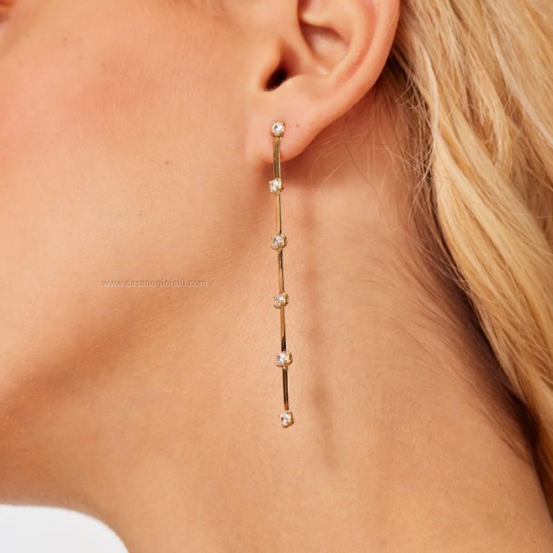 orecchini pendenti lunghi in acciaio 316l e finitura pvd oro 14k, con cubic zirconia. misura orecchini: 8cm