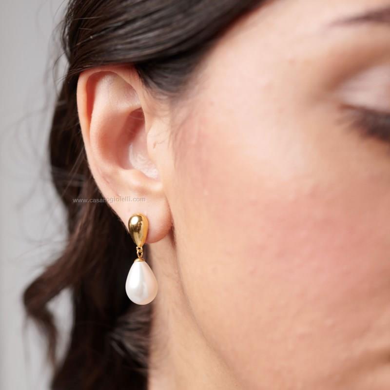 orecchini pendenti in acciaio 316l e finitura pvd oro 14k, con perle di conchiglia. misura orecchini: 3cm