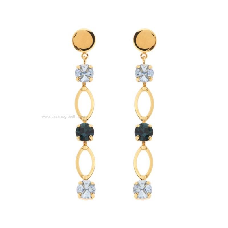 orecchini pendenti dal design moderno e raffinato, caratterizzati da luminosi cristalli blu a taglio tondo. realizzati in metallo dorato con trattamento di cataforesi. lunghezza pendente 5cm