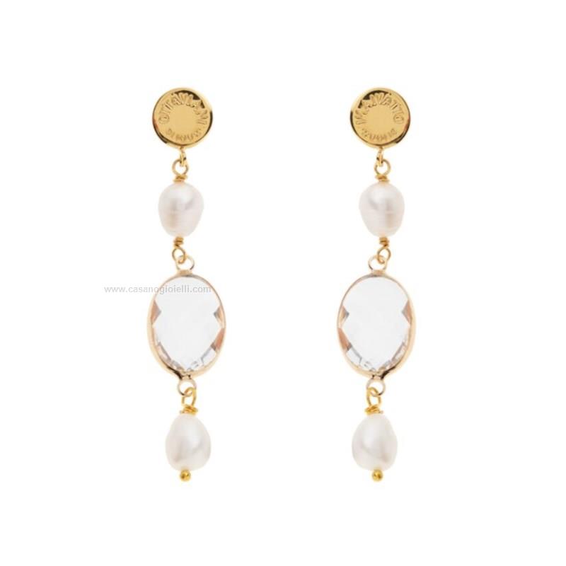 orecchini pendenti dal design moderno e raffinato, caratterizzati da luminosi cristalli ovali e perle sintetiche. realizzati in metallo dorato con trattamento di cataforesi. lunghezza pendente 5cm