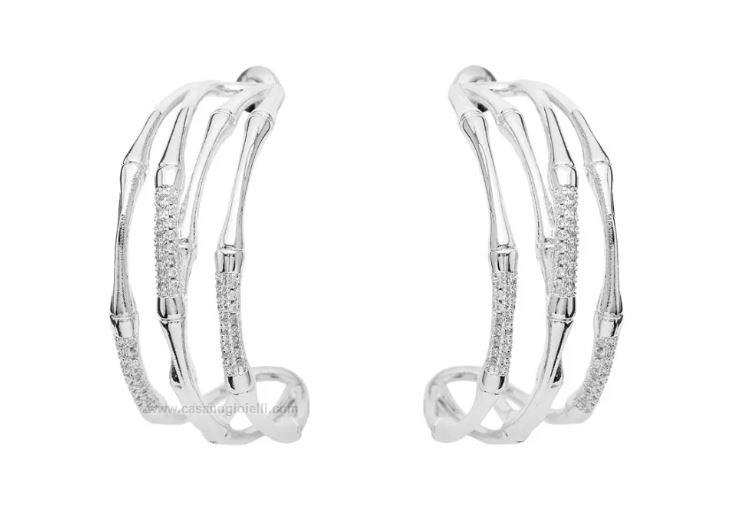 orecchini mezzo cerchio da donna in metallo e zirconi, chiusura a pressione