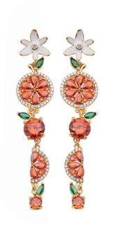 orecchini donna pendenti dal design raffinato in finitura dorata, decorati con elementi floreali e agrumati in smalti colorati, cristalli luminosi e dettagli verdi. un accessorio elegante e vivace, ideale per donare luce e originalità al look.