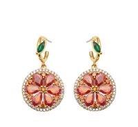 orecchini eleganti dal design floreale, realizzati con finitura dorata e impreziositi da zirconi luminosi. il pendente circolare presenta un raffinato motivo a fiore con pietre rosse, incorniciato da una fila di zirconi che ne esaltano la brillantezza. la parte superiore è arricchita da una pietra verde che dona contrasto e carattere al gioiello.