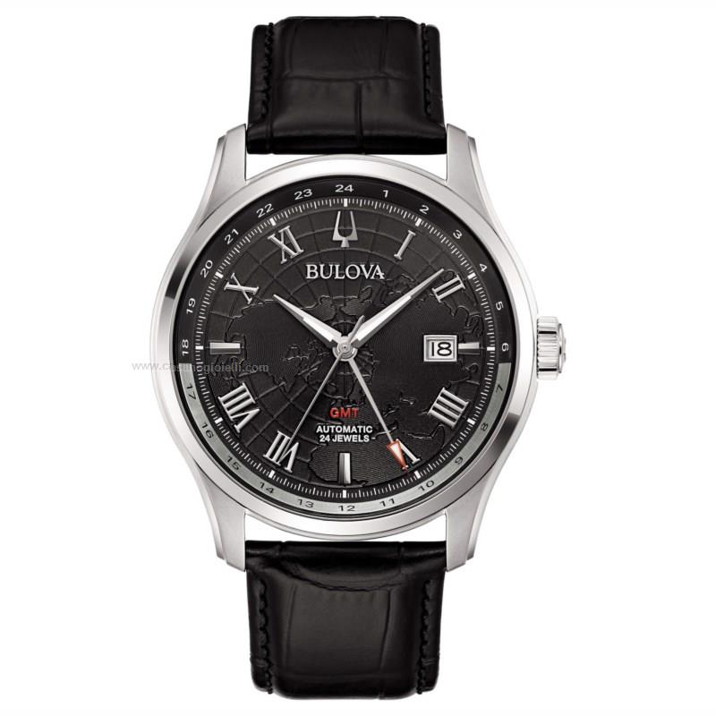 orologio uomo. funzione gmt, con movimento meccanico. presenta 24 rubini all'interno del meccanismo. riserva di carica: 40 ore. cassa in acciaio, fondello a vite con oblo trasparente e movimento a vista. vetro zaffiro, quadrante analogico, di colore nero. diametro cassa 43mm. cinturino in pelle, di colore nero. spessore: 1,24cm. peso: 90gr.