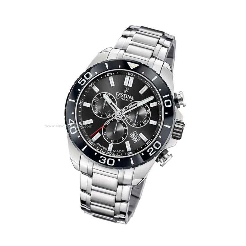 orologio cronografo festina della collezione swiss made , pensato per gli amanti dello sport e della precisione. cassa dal ΓΈ di 44mm in acciaio ceramico, quadrante nero con contatori cronografici che indicano ore, minuti e secondi, il tutto è protetto da vetro zaffiro. il cinturino è in acciaio 316l che assicura stabilità al polso. datario a ore 3 e resistente all'acqua 5 atm.