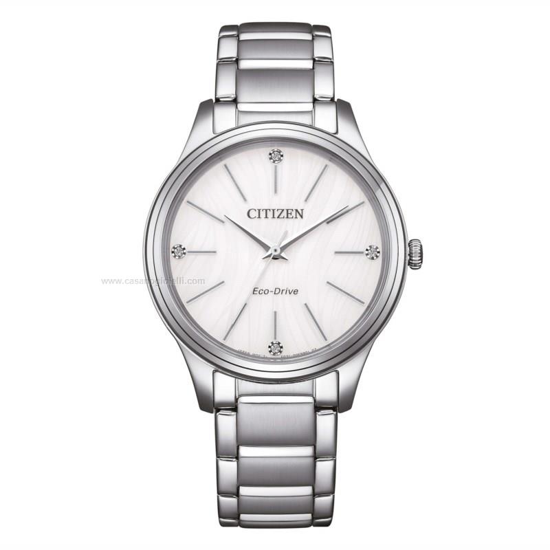 orologio solo tempo da donna della citizen della linea lady dal design elegante e luminoso da indossare ogni giorno. cassa dal diametro di 34mm, con quadrante bianco perla delicatamente lavorato, con effetto glitterato, impreziosito da indici sottili e cristalli che aggiungono un tocco gioiello senza rinunciare alla sbrietà. le lancette garantiscono una lettura chiara del tempo. il movimento eco-drive a carica luce elimina la necessità di sostituire la batteria, assicurando praticità e affidabilità nel tempo. resistente all'acqua 5 atm.