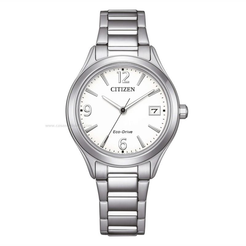 orologio solo tempo da donna della citizen della linea lady dal design elegante e luminoso da indossare ogni giorno. cassa dal diametro di 33mm, quadrante bianco con datario a ore 3 delicatamente lavorato, le lancette garantiscono una lettura chiara del tempo. orologio con bracciale in acciaio 316l . il movimento eco-drive a carica luce elimina la necessità di sostituire la batteria, assicurando praticità e affidabilità nel tempo. resistente all'acqua 5 atm