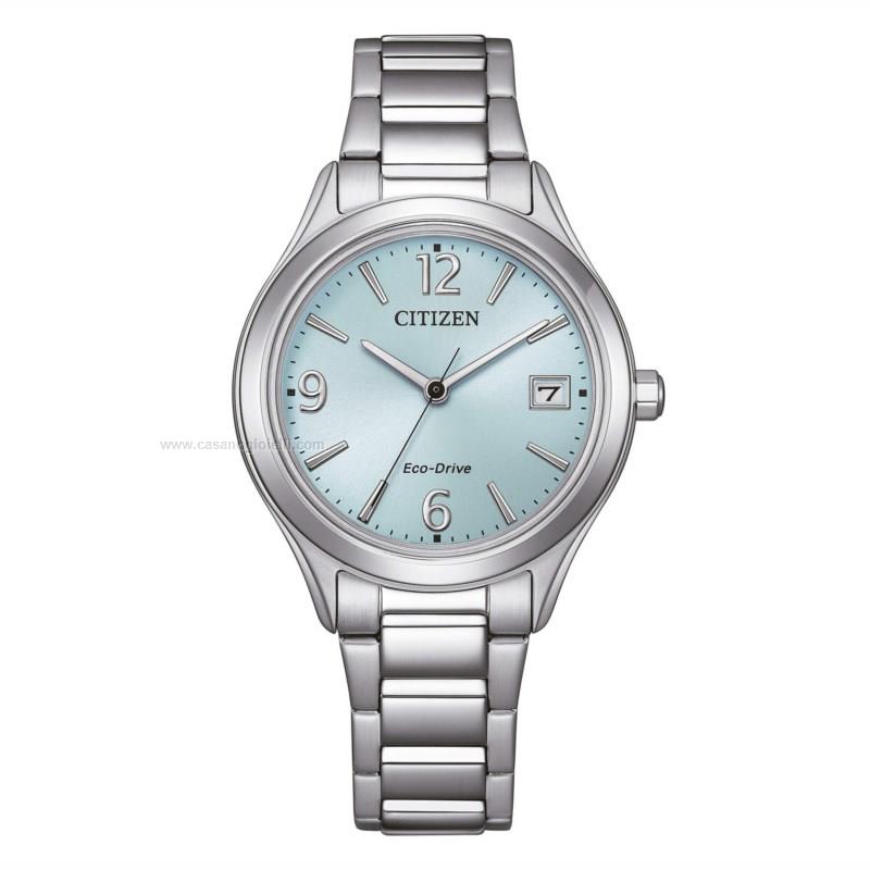 orologio solo tempo da donna della citizen della linea lady dal design elegante e luminoso da indossare ogni giorno. cassa dal diametro di 33mm, quadrante celeste con datario a ore 3 delicatamente lavorato, le lancette garantiscono una lettura chiara del tempo. orologio con bracciale in acciaio 316l . il movimento eco-drive a carica luce elimina la necessità di sostituire la batteria, assicurando praticità e affidabilità nel tempo. resistente all'acqua 5 atm