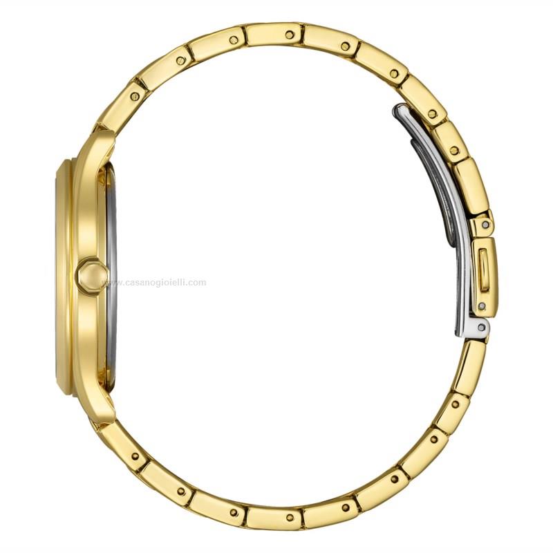orologio solo tempo da donna della citizen della linea lady dal design elegante e luminoso da indossare ogni giorno. cassa dal diametro di 33mm, quadrante bianco con datario, delicatamente lavorato, le lancette garantiscono una lettura chiara del tempo. vetro cristallo minerale resistente ai graffi. orologio con bracciale in acciaio 316l color oro. il movimento eco-drive a carica luce elimina la necessità di sostituire la batteria, assicurando praticità e affidabilità nel tempo. resistente all'acqua 5 atm