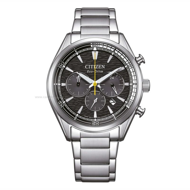 orologio cronografo da uomo della citizen appartenente alla collezione of collection. cassa da 43mm e bracciale in acciaio 316l, quadrante nero con contatori cronografici che garantiscono un'ottima leggibilità. grazie alla tecnologia eco-drive si alimenta con qualsiasi fonte di luce , naturale o artificiale, eliminando la necessità di sostituire la batteria. l'orologio è dotato di funzione cronografo, che consente di misurare con precisione gli intervalli di tempo. lancetta centrale per i secondi del cronografo, contatori per i minuti cronometrati, piccoli secondi per l'orario continuo. datario a ore 3 e resistente all'acqua 5 atm.