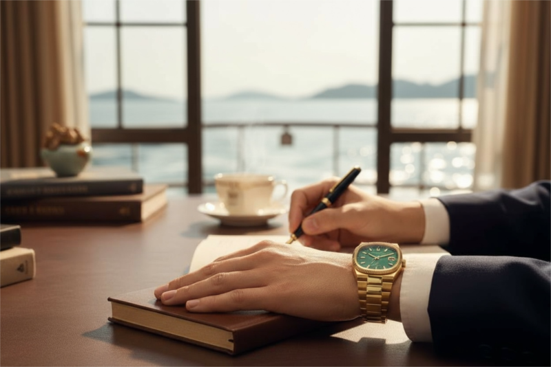 orologio uomo, anno 2025. funzione solotempo con movimento 262 khz precisionist. cassa in acciaio, con finitura gold. quadrante anaogico, di colore verde. diametro cassa: 38mm. cinturino in acciaio, fibbia deployante con pulsanti. spessore: 1,33 cm. peso: 142gr.