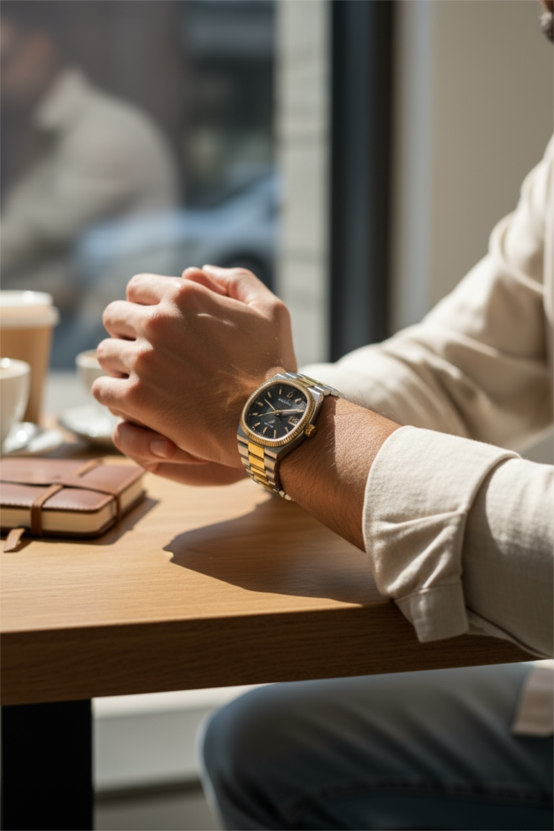 orologio uomo, anno 2025. funzione solotempo, movimento 262 khz precisionist. cassa in acciaio, con finitura acciaio oro. diametro cassa: 38mm. vetro zaffiro, prsenta il lentino. quadrante analogico, di colore nero. spessore: 1,33cm. peso: 142gr,