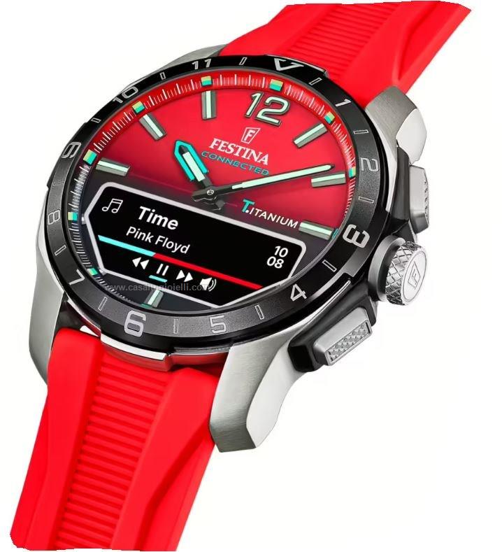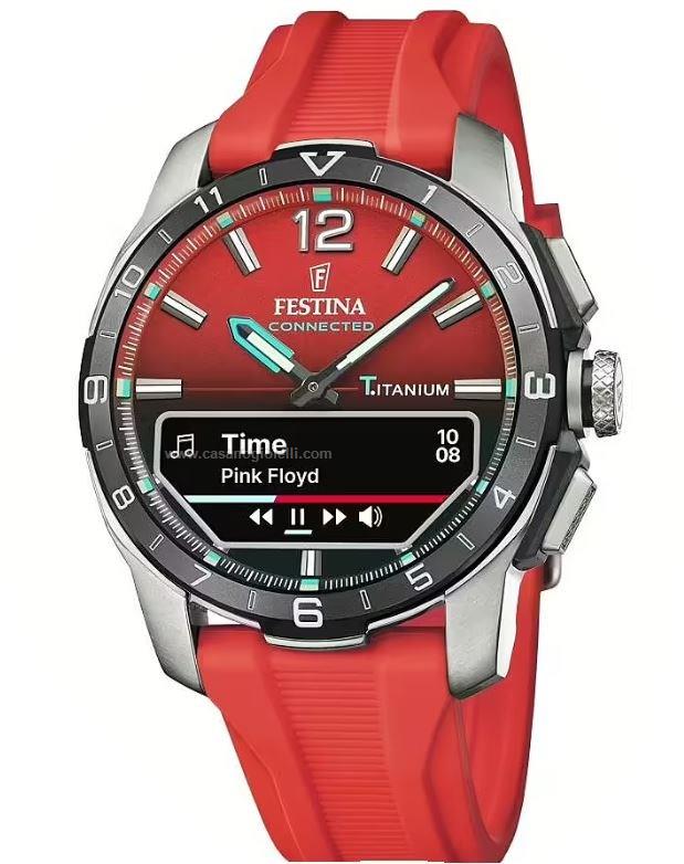 orologio uomo festina appartenente alla collezione connected d, smartwatch. realizzato con cassa in titanio da 45mm , vetro zaffiro resistente ai graffi e cinturino in silicone rosso. il quadrante rosso con indici, integra un display digitale. consente di gestire chiamate, notifiche e musica, inoltre monitora anche le attivita' quotidiane. restitenza all'acqua di 3 atm.