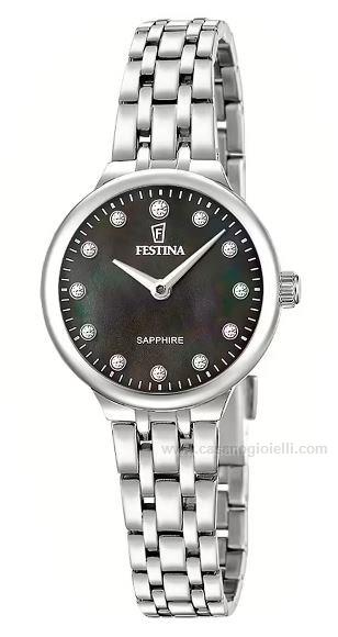 orologio donna festina dal design elegante e luminoso, realizzato in acciaio con bracciale coordinato. il quadrante nero, arricchito da punti luce, dona profondità e raffinatezza, rendendolo perfetto per ogni occasione. dotato di movimento al quarzo analogico con funzione solo tempo, presenta una cassa in acciaio da 26 mm, cinturino in acciaio e impermeabilità 3 atm, resistente agli schizzi.