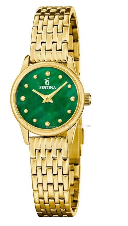 orologio donna festina dal design elegante e luminoso, realizzato in acciaio dorato con bracciale coordinato. il quadrante verde , arricchito da punti luce, dona profondità e raffinatezza, rendendolo perfetto per ogni occasione. dotato di movimento al quarzo analogico con funzione solo tempo, presenta una cassa in acciaio da 24 mm, cinturino in acciaio con finitura color oro e impermeabilità 3 atm, resistente agli schizzi.